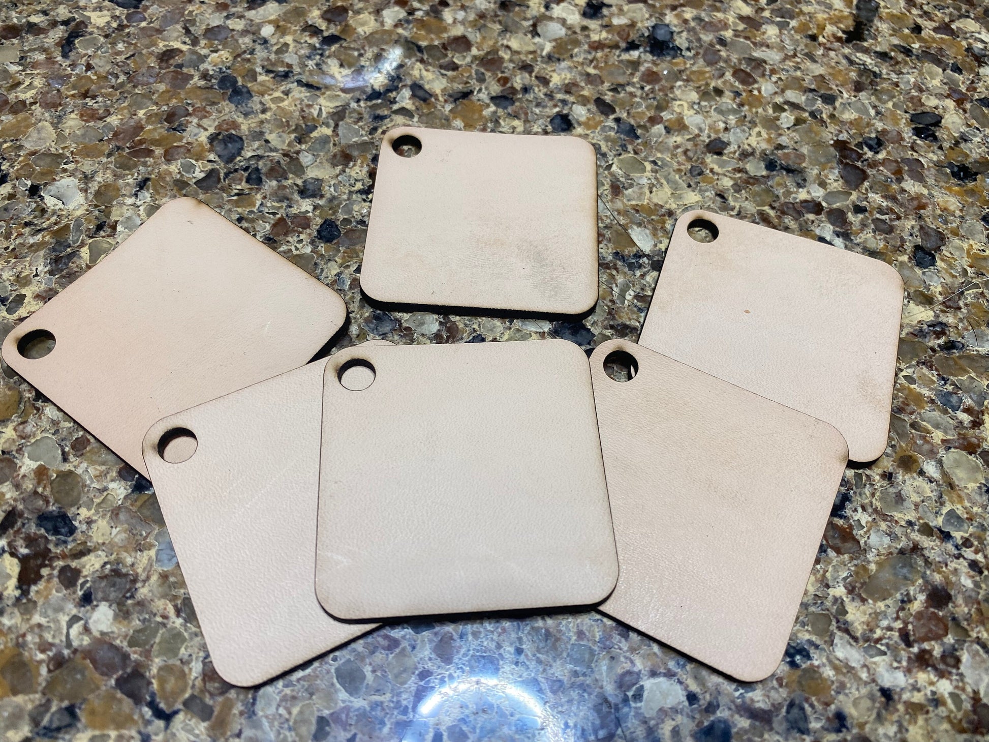 Test and showcase your leather finishes perfectly! This set includes 6 pre-cut 2x2" squares of durable 5-6oz Veg-Tan leather, complete with a steel screw loop. Ideal for testing dyes, finishes, and presenting color options consistently.